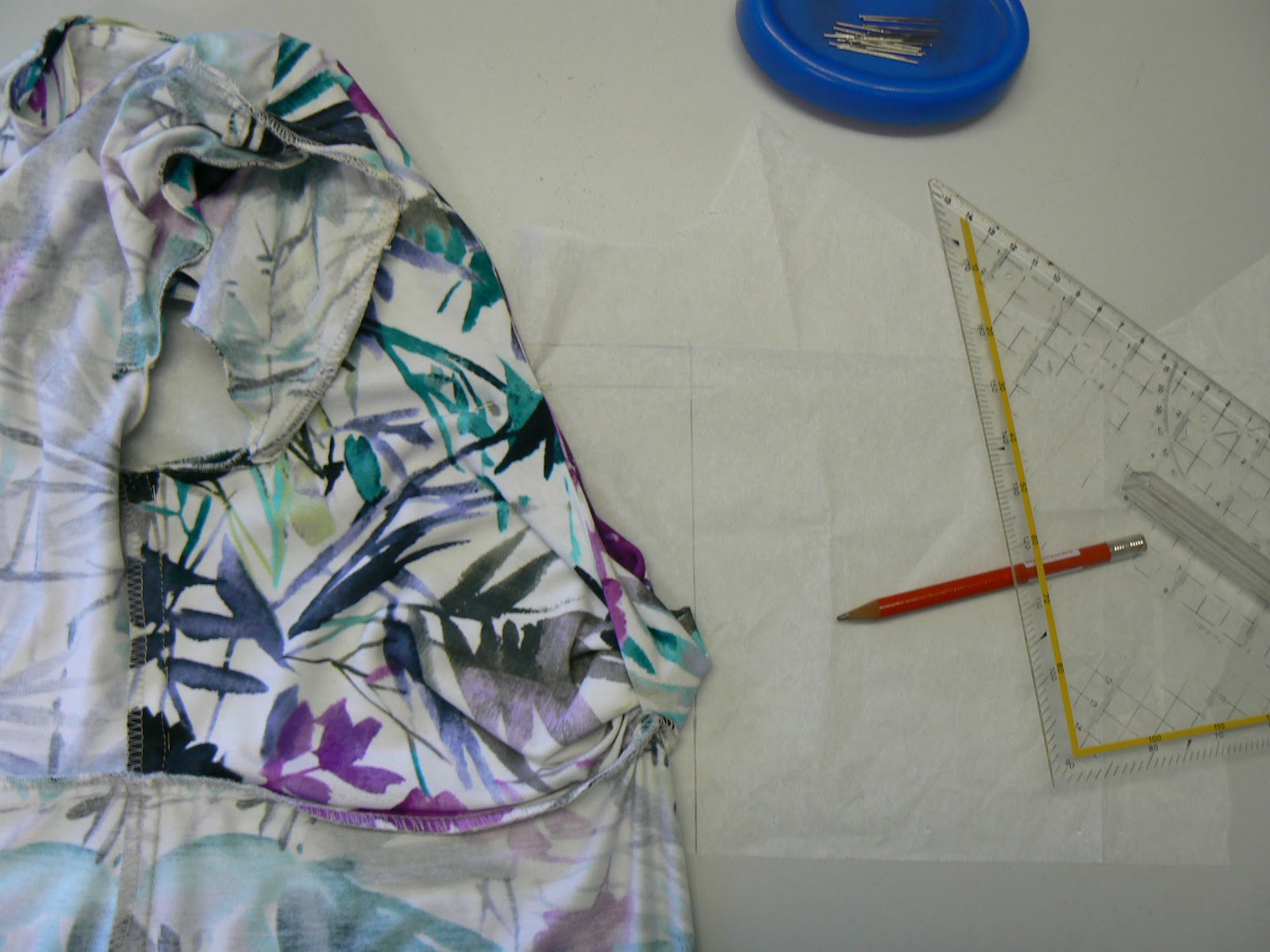 Das Shirt halbiert aufeinander stecken, so dass die Seitennähte aufeinander liegen. Mit Seidenpapier die Nahtlinien samt Nahtzugabe abzeichnen, so dass die vordere Mitte nach oben gerade verlängert werden kann.