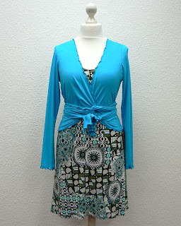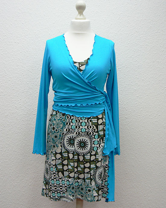 Kombiniert haben wir den Wickelpulli Freiburg mit dem Kleid Tomio, Mod. 06-60, genäht aus den neuesten Stoffen in unserem Laden!