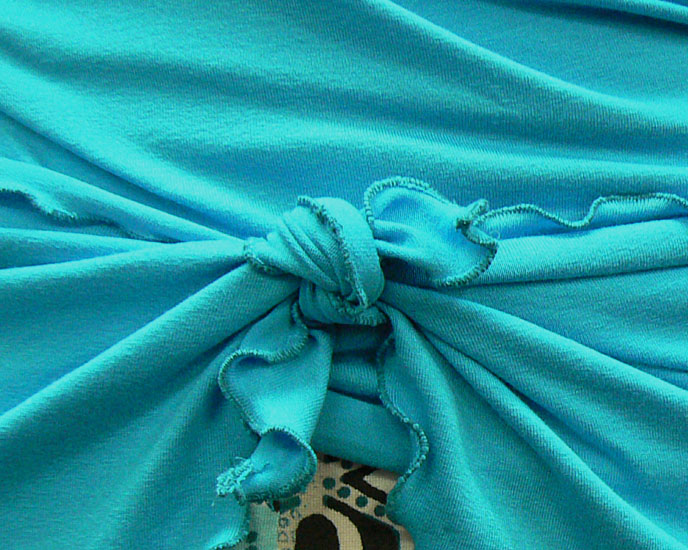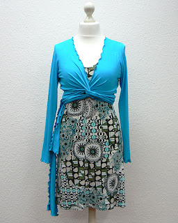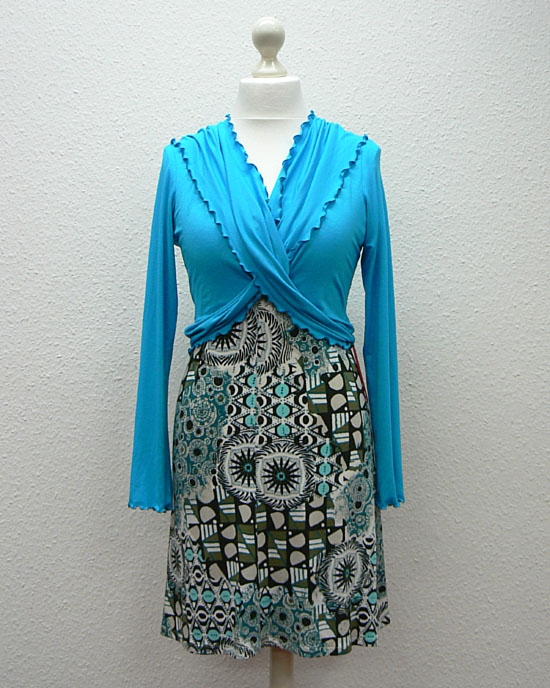 Variante 1: bedruckter Viscosejersey in oliv-ecru-türkis-braun kombiniert mit türkisem Viscosejersey.