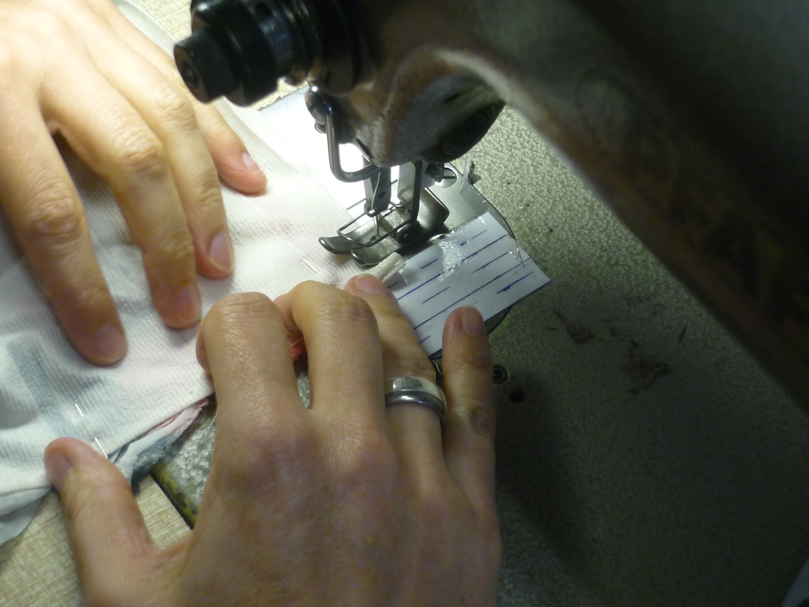 Jerseystreifen mittig mit dem Overlockstich der Nähmaschine aufsteppen. Der Streifen liegt kantig an der Saumkante.