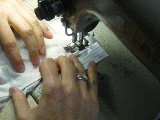 In der Vorderen Mitte einen 3cm breiten ca 11cm langen Streifen platzieren und diesen mit 2 Nähten aufsteppen bis ca 2,5cm vor Streifenende, da Stiche verriegeln. Die letzten Zentimeter den Stich wieder mittig ansetzen und bis Bandende steppen, auch hier Stiche verriegeln.